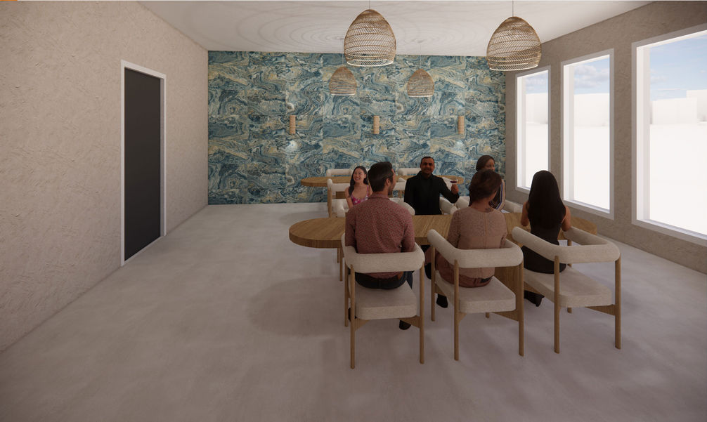 Situated beachfront with minimal existing structures nearby, the venue design prioritized abundant natural lighting through its expansive windows. This allowed for a deliberate focus on distinctive lighting features in the overall design. A custom modern chandelier graces the bar area, while custom wicker pendant lights adorn the private dining tables, harmonizing beautifully with the blue marble wall feature. Throughout the interior walls, handmade travertine wall sconces add a warm glow, highlighting the clay texture of the walls.